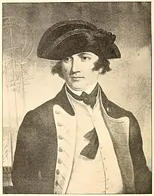 Esek Hopkins was born in Scituate, in the Colony of Rhode Island and Providence Plantations, into one of the most prominent families of what is today's Rhode Island. At the age of twenty he went to sea and rapidly came to the front as a good sailor and skillful trader.[1] Before the Revolutionary War he had sailed to nearly every quarter of the Earth, and commanded a privateer in the French and Indian War. In the interval between voyages, he was engaged in Rhode Island politics, served as a deputy to the Rhode Island General Assembly, and rendered efficient support to his brother Stephen, who became governor in 1755.[1] In September 1764, during his time as a privateer and merchant, Hopkins took command of the slave ship Sally, owned by Nicholas Brown and Company.[4] Hopkins had no prior experience in operating a slave-trading vessel at the time, and the 15-month voyage would result in the death of 109 out of 196 slaves. In late 1765, Sally arrived at its first trading destination in the West Indies, but the surviving African captives were in such poor health that most sold for very little. Hopkins' disastrous command of Sally contributed to Moses Brown's turn against participation in the Atlantic slave trade.[5]