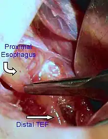 Treatments for the condition vary depending on its severity. The most immediate and effective treatment in the majority of cases is a surgical repair to close the fistula/s and reconnect the two ends of the esophagus to each other. Although this is usually done through an incision between the ribs on right side of the baby, a technique using three small incisions (thoracoscopy) is being used at some centers.[12]