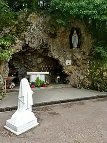 View of the replica grotto at Nevers, with a statue of Bernadette kneeling, reenacting the 1858 apparitions.