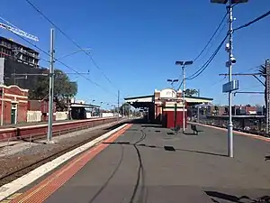In 1878, a completely new station, with a single platform, was provided, on the site of the present island platform, with passenger subways and footbridges added in 1886, along with conversion of the island platform to the current layout. It was also at that time that a rail overpass was provided at Mount Alexander Road, in what was one of the first grade separation projects to be carried out in the state. In 1909, the present buildings were provided, along with a centre track between Platforms 1 and 2.[5]