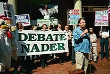 - Calvo, Dana (October 21, 2000). "Nader Refuses to Cease Fire on Gore, Bush". Los Angeles Times. Retrieved September 19, 2016.