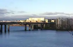 Finally in 1927 the city council decided on building a permanent bridge, inaugurated the following year. The central part of the steel construction spanned the 185 metres between the islands using five 40 metres long spans, and was continuous on both sides with viaducts giving the entire bridge a total length of 339 metres. It was 7,6 metres wide with a 5,2 metres wide roadway, and offered an horizontal clearance of 13 metres. A severe bus accident in 1948 when a bus crashed through a railings of the bridge killing 11, lead to an examination of the bridge in 1951, followed by reinforcement by draw barriers and the amelioration of the pile foundation.[3]