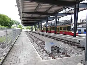 The Forchbahn was originally opened as a roadside electric tramway, and has been progressively upgraded into a modern electric railway. Between the Forchbahn's opening in 1912 and 1949, it connected at Esslingen with the Uster–Oetwil tramway (UOeB), another similar roadside tramway that closed in 1949. The stop both lines shared was situated to the east of the existing station near the junction of Löwenstrasse and Usterstrasse, and is still marked by the presence of the Restaurant Bahnhof. The line's terminus was relocated to its current site in 1995.[4][5][6]