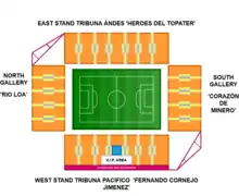 This stand was named in honor of the Loa River, the longest river in Chile. It crosses the city of Calama. It is the livelihood for indigenous communities of Atacama. Visiting team supporters sit in this gallery.