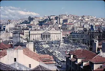 Rossio Square, Lisbon, in June 1968, showing a TAP airline commercial in the background at night