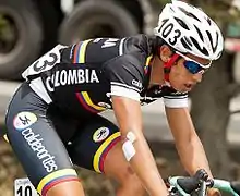Jhoan Esteban Chaves Rubio (born 17 January 1990) is a Colombian professional road bicycle racer, who currently rides for UCI WorldTeam EF Education–EasyPost.[8] Born in Bogotá, Chaves has competed as a professional since the start of the 2012 season, having signed for the Colombia–Coldeportes team as a neo-pro,[9] after three seasons as an amateur with the Colombia es Pasión–Coldeportes team. Chaves is a two-time grand tour podium finisher, and a monument winner.