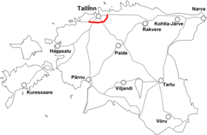 The T11 (Estonian: põhimaantee 11; Tallinna ringtee) is a semi-orbital highway around Tallinn, connecting its metropolitan region to numerous national main routes. The road also serves as a compulsory truck traffic route (as in Nõmme, the T4 is banned for truck traffic). The T11 is a part of the European route E265.[2]