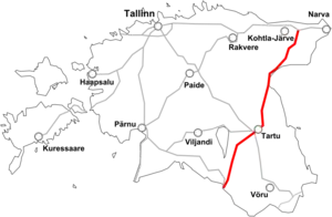 The T3 (Estonian: põhimaantee 3) is a major north–south highway in Estonia connecting the capital of Ida-Viru County, Jõhvi, to southern Estonia and the Latvian border. The T3 is a part of the European route E264.[3] The route runs through the counties of Ida-Virumaa, Jõgevamaa, Tartumaa and Valgamaa.