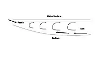 These estuaries are characterized by a sharp density interface between the upper layer of freshwater and the bottom layer of saline water. River water dominates in this system, and tidal effects have a small role in the circulation patterns. The freshwater floats on top of the seawater and gradually thins as it moves seaward. The denser seawater moves along the bottom up the estuary forming a wedge shaped layer and becoming thinner as it moves landward. As a velocity difference develops between the two layers, shear forces generate internal waves at the interface, mixing the seawater upward with the freshwater.[6] An example is the Mississippi estuary.