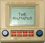 The Etch A Sketch Animator (known simply as "The Animator" in Canada and Europe), debuted in 1986,[7] and featured a 40x30 dot matrix display and used two knobs for drawing, like a regular Etch A Sketch, with several buttons to manipulate the drawings. The initial price was US$89.99 (equivalent to $220 in 2021). It had two kilobytes of memory, capable of storing 12 frames of pictures in any combination up to 96 times. It contained a speaker, which made static-like sounds when the knobs were moved and during animations.[16]