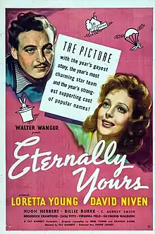 Eternally Yours (aka Whose Wife) is a 1939 American comedy drama film produced and directed by Tay Garnett with Walter Wanger as executive producer, from a screenplay by C. Graham Baker and Gene Towne. The film stars Loretta Young and David Niven, and also features a strong supporting cast including Broderick Crawford, Billie Burke, Eve Arden, ZaSu Pitts, and C. Aubrey Smith. Composer Werner Janssen was nominated for the Academy Award for Best Music.[2]