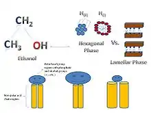 There are various usages of ethanol which include an additive to gasoline, a primary ingredient for food preservation as well as alcoholic beverages and being used for transdermal drug delivery. For example, it can function as an antiseptic in topical creams to kill bacteria by denaturing proteins. Ethanol is an amphiphilic molecule meaning that it has chemical and physical properties associated with hydrophobic and hydrophilic molecules.[3][4] Although, studies show that when penetrating through the biomembrane its hydrophobic abilities appear to be limited based on its preference to bind closely to the hydrophilic region of the phospholipids.[3][4] There are various issues presented in regards to ethanol's ability to penetrate through the biomembrane and cause a reorganization of the phospholipids towards non-lamellar phases. The issues are: 1) how the alteration of the phospholipids' phase occurs 2) understanding the significance of ethanol's interaction with membrane proteins and membrane phospholipids 3) understanding the permeability of the biomembrane based on the tolerance and adaptation level in the presence of ethanol although this process appears to be concentration-dependent 4) determining the significance of ethanol's amphiphilic character as it relates to its ability to partition throughout the membrane by increasing the fluidity of it. Ethanol's hydrophobic properties are limited and primarily binds close the hydrophilic region of the phospholipid. This bonds creates strong hydrogen bonds and leads to a strong interlocking amongst the acyl chains 5) why the presence of cholesterol; a sterol compound, inhibits ethanol's ability to disrupt the membrane and 6) deriving the molecular-level mechanism of the entire process.[3][4]