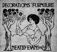 Larcombe's work can be seen in contemporary publications by The Studio Magazine,[4] Stone,[5] Von Larisch,[6] Walter Shaw Sparrow[7] and Salwey.[8] In the spring of 1917, American retailer Sears marketed green-bordered cotton cloth "coverettes" bearing Larcombe illustrations to customers looking to decorate nurseries and children's rooms. Prior to that she had illustrated a number of "rag books" for Dean & Son.[9] Her designs were also used for chromolithographed postcards printed by E. W. Savory Co. of Bristol and she provided an advert for Arts & Crafts furniture designers Neatby & Evans.[10]
