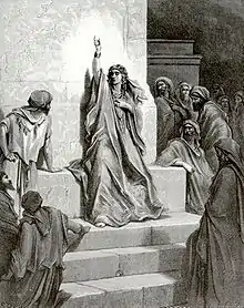 Jesus often spoke directly to women in public. The disciples were astonished to see Jesus talking with the Samaritan woman at the well of Sychar (John 4:7–26). He spoke freely with the woman taken in adultery (John 8:10–11), with the widow of Nain (Luke 7:12–13), the woman with the bleeding disorder (Luke 8:48; cf. Matt. 9:22; Mark 5:34), and a woman who called to him from a crowd (Luke 11:27–28). Similarly, Jesus addressed a woman bent over for eighteen years (Luke 13:12) and a group of women on the route to the cross (Luke 23:27–31). Jesus spoke in a thoughtful, caring manner. Each synoptic writer records Jesus addressing the woman with the bleeding disorder tenderly as "daughter" and he refers to the bent woman as a "daughter of Abraham" (Luke 13:16). Theologian Donald G. Bloesch infers that "Jesus called the Jewish women 'daughters of Abraham' (Luke 13:16), thereby according them a spiritual status equal to that of men."[60]: 28