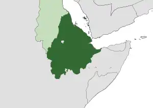 One of the defining features of Ethiopia under the Solomonic dynasty was territorial expansion, primarily into Muslim areas. This began during the reign of Yekuno Amlak himself, conquering the Sultanate of Showa in 1285.[27] The most significant expansions took place under Amda Seyon I, who conquered the Kingdom of Damot, the Hadiya Sultanate, Gojjam, Fatagar, the Sultanate of Dawaro, the Sultanate of Bale, and the Sultanate of Ifat.[28] By the early 16th century, the empire's borders reached past Massawa in the north, past the Omo River in the south, to the Adal Sultanate in the east and near the confluence of the Didessa River and the Blue Nile in the west.[29]