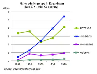 | Kazakhs | 3,392,751 | 82.89% | 3,627,612 | 58.52 % | 2,327,625 | 37.84 % | 2,794,966 | 30.02 % | 4,161,164 | 32.39 % | 5,289,349 | 36.02 % | 6,534,616 | 39.69 % | 7,985,039 | 53.40 % | 10,096,763 | 63.07 % | 13,497,891 | 70.35 % |