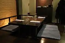 Table etiquette in South Korea can be traced back to the Confucian philosophies of the Joseon period.[1][7] Traditionally when dining, South Koreans use cushions to sit on the floor and eat from a low table.[8] The floor is generally heated by the ondol, an underfloor heating system. This custom is still common at many restaurants in South Korea. The dining area in a restaurant is generally on a raised platform, and visitors are expected to remove their shoes before stepping onto it. Today, most restaurants also have tables and chairs for visitors who feel uncomfortable sitting on the floor.[1]
