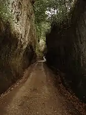 The Vie Cave, narrow cuttings often running deeply through hills, are probably little changed since Etruscan times. As well as connecting sites, these may have had a defensive function in times of war. Their construction may have mainly resulted from the wearing through soft tufo bedrock by iron-rimmed wheels, creating deep ruts that required the road to be frequently recut to a smooth surface. Their dating can only be deduced by that of settlements they pass between, and objects from tombs beside them.[47] The 7th and 6th centuries show a move to replace earlier tracks only suitable for mules and pedestrians with wider and more engineered roads capable of taking wheeled vehicles, using gentler but longer routes through hilly country.[48]
