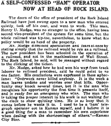 - Staff (June 27, 1881). "KNIGHTS OF THE KEY. A Talk With a Telegrapher About Impending Troubles -- Will They Strike?" Pittsburgh Post-Gazette. Pittsburgh, Pennsylvania. "Reporter -- Would a strike be successful? 'I believe if it becomes necessary it will succeed. The only point we have to contend with is 'ham' operators, -- men without ability to break stone on a road, who float into the service, under the head of cheap labor and lose more money to the company by making blunders than they can make in five years.' "
