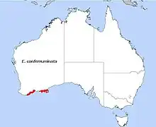 The species has become naturalised in other parts of the Southwest region of Western Australia, via revegetation projects, windbreaks, and as a garden escapee.[6] E. conferruminata has a limited distribution in Victoria where it has become sparingly established in the Gippsland and Wimmera areas after having spread by seed dispersal from planted trees.[5] The species, once sold as Eucalyptus lehmannii, has also become naturalised in California.[15]