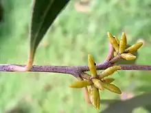 Eucalyptus copulans is a tree, often with several main trunks and with smooth grey or green bark that is shed in ribbons. Young plants have narrow elliptical leaves that are dull greyish green, up to 65 mm (2.6 in) long and 25 mm (0.98 in) wide on a petiole 2–7 mm (0.079–0.276 in) long. Adult leaves are lance-shaped, the same glossy green on both sides, 60–120 mm (2.4–4.7 in) long and 10–18 mm (0.39–0.71 in) wide on a petiole 5–10 mm (0.20–0.39 in) long. The flower buds are arranged in groups of eleven or more in leaf axils on a peduncle 3–8 mm (0.12–0.31 in) long, the individual buds sessile or on a pedicel up to 1 mm (0.039 in) long. Mature buds are cylindrical, up to 8 mm (0.31 in) long and 2.5 mm (0.098 in) wide with a conical operculum about the same length as the floral cup. The fruit is a woody, more or less spherical capsule 4–6 mm (0.16–0.24 in) long and about 5 mm (0.20 in) wide with the valves enclosed below the rim.[3][4]