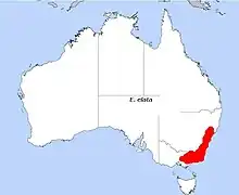 River peppermint usually grows along watercourse but sometimes also in undulating country, on rocky ridges or on scree slopes in forest. It grows near the coast and nearby tablelands south from Putty in New South Wales to eastern Victoria.[3][4][5]