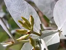 Eucalyptus gillii, known as the curly mallee, Arkaroola mallee,[2] or silver mallee,[3] is a species of mallee or small tree that is endemic to inland Australia. It has smooth bark, sometimes with rough bark near the base, often only juvenile, usually glaucous leaves in the crown, flower buds in groups of between seven and eleven, pale yellow flowers and barrel-shaped or shortened spherical fruit.