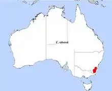 Eucalyptus olsenii, commonly known as the Woila gum,[2] is a species of small tree that is endemic to a restricted area on the Southern Tablelands of New South Wales. It has smooth bark with rough bark on the lower trunk, lance-shaped to curved adult leaves, flower buds in groups of seven, white flowers and barrel-shaped or urn-shaped fruit.