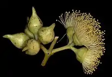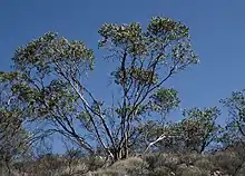 Eucalyptus oxymitra, commonly known as the sharp-capped mallee,[2] is a species of mallee that is endemic to remote parts of Central Australia. It has rough bark on the trunk, smooth greyish bark above, lance-shaped to egg-shaped adult leaves, flower buds in groups of seven, white to pale yellow flowers and hemispherical fruit.