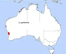 Pear-fruited mallee grows in flat and gently undulating country between the Murchison River in the north and Dowerin, Goomalling and Cowcowing in the south.[2][3][5]
