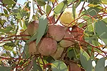 Eucalyptus pyriformis is a straggly mallee that typically grows to a height of 1.5–5 m (4 ft 11 in – 16 ft 5 in) and to a width of 3–6 m (9.8–19.7 ft) and forms a lignotuber. In nature, it tends to be multi-stemmed but in cultivation it is more likely to be single stemmed. The bark is smooth, grey or salmon-pink coloured, often shedding in ribbons at the base. Young plants and coppice regrowth have leaves that are arranged alternately, dull bluish green, egg-shaped to broadly lance-shaped, 40–70 mm (1.6–2.8 in) long and 30–45 mm (1.2–1.8 in) wide and petiolate. Adult leaves are the same shade of dull bluish or greyish green on both sides, egg-shaped to lance-shaped, 55–95 mm (2.2–3.7 in) long and 15–30 mm (0.59–1.18 in) wide, tapering to a petiole 10–30 mm (0.39–1.18 in) long. Mature buds are oval, 32–60 mm (1.3–2.4 in) long and 20–30 mm (0.79–1.18 in) wide with ribs on the sides and a beaked operculum. Flowering occurs between May and October and the flowers are red, pinkish or creamy white flowers. The fruit is a woody, pendent, conical capsule 25–40 mm (0.98–1.57 in) long and 30–55 mm (1.2–2.2 in) wide on a pedicel 15–60 mm (0.59–2.36 in) long and with prominent ribs on the sides.[2][3][4][5][6][7]