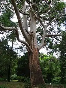 South of Sydney Harbour and the Parramatta River, pure stands of E. saligna give way to hybrid populations with bangalay (E. botryoides).[4]