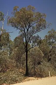 This tree grows on shallow soil on sandstone hills in Carnarvon National Park from west of Alpha to east of Tambo in Queensland.[2][3]