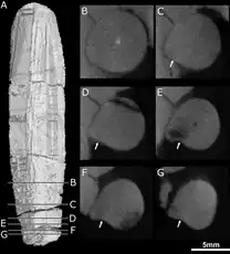 CT scanning of the known specimens of Euchambersia by Benoit and colleagues was subsequently used to provide more concrete support in favour of the venom hypothesis. The canals leading into and from the maxillary fossae, as revealed by the scans, would primarily have supported the trigeminal nerve as well as blood vessels.[32][33][34] However, the fact that the canals also directly lead to the root of the canines would suggest that they had a secondary role in venom delivery. In all, Euchambersia seems to have had a venom gland (housed in the maxillary fossae), a delivery mechanism of the venom (the maxillary canals), and an instrument by which a wound for venom delivery can be inflicted (the ridged canines), which satisfy the criteria of a venomous animal as defined by Wolfgang Bücherl.[35] Benoit et al. noted that this does not conclusively demonstrate that Euchambersia was actually venomous, especially given the previously stated objections. Additionally, there are no living animals with a delivery system analogous to the proposed system for Euchambersia (most deliver venom through the lower jaw,[36][37] while snakes have specialized ducts.[2][38]