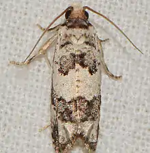 The wingspan is about 16.5 mm. The forewings have a distinct black-and-white pattern. Adults have been recorded on wing from May to September and are attracted to light.[5]