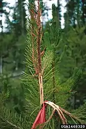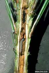 Larvae feed on pine species and is considered a pest on Pinus ponderosa. They mine the pith of terminal shoots.