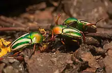 Eudicella gralli, sometimes called the flamboyant flower beetle or striped love beetle, is a brightly coloured member of the scarab beetle family, in the subfamily known as flower beetles. Their shells seem to have a prismatic quality, refracting the ambient light to give the green of their carapace a rainbow tint. This species of flower beetle lives in the rainforests of Africa, where it feeds on the nectar and pollen of flowers, but is popular in the exotic pet trade. The larvae of the flower beetle live in decaying wood, feeding on dead wood and leaf litter. Adults reach lengths of 25–40 millimetres (0.98–1.57 in). As in other species of this genus, the males have a "Y"-shaped horn, used to fight over females. The females have a shovel-like tusk, used for burrowing in wood. During their gestation period they will dig into the wood and lay eggs.
