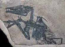 Eudimorphodon was a pterosaur that was discovered in 1973 by Mario Pandolfi in the town of Cene, Italy and described the same year by Rocco Zambelli. The nearly complete skeleton was retrieved from shale deposited during the Late Triassic (mid to late Norian stage),[1] making Eudimorphodon one of the oldest pterosaurs known.[2] It had a wingspan of about 100 centimeters (3.3 ft)[3] and at the end of its long bony tail may have been a diamond-shaped flap like in the later Rhamphorhynchus. If so, the flap may have helped it steer while maneuvering in the air.[4] Eudimorphodon is known from several skeletons, including juvenile specimens.
