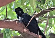 In Bangladesh, they parasitise long-tailed shrike (Lanius schach), common myna (Acridotheres tristis) and house crows (Corvus splendens) at about 35.7, 31.2 and 10.8% rates respectively.[26] Host nests at low heights and nearer to fruit trees tended to be preferred by koels.[27] In southern Thailand and the Malay Peninsula, koels have shifted host from crows to mynas (Acridotheres sp.) as the latter became more common in the late 1900s.[16] In the Indian Subcontinent they have sometimes been found to parasitize the black drongo,[28] the European magpie[29] and possibly the black-headed oriole.[30][31] Males may distract the hosts so that the female gets a chance to lay an egg in the nest.[32][33] More often however, the female visits the nest of the host alone.[16] The koel is not known to lay eggs in an empty host nest and a study in Pakistan found that the first koel eggs were laid, on average, within one and half days of the laying of the host's first egg.[34] The chicks of the koel hatched about 3 days ahead of the host chicks.[35] Koels usually lay only an egg or two in a single nest but as many as seven to eleven eggs have been reported from some host nests.[36][37][38] A female may remove a host egg before laying. Eggs hatch in 12 to 14 days. The young koel does not always push out eggs or evict the host chicks, and initially calls like a crow. The young fledge in 20 to 28 days.[16] Unlike some other cuckoos, the young do not attempt to kill the host chicks, a trait that is shared with the channel-billed cuckoos which are also largely frugivorous as adults.[39] It has been suggested that koels, like some other brood parasites do not evict the host chicks due presumably due to the higher cost of evicting nestmates. A small parasite may not be able to evict large host eggs or chicks from a deep Corvid nest without risking starvation and possibly accidental self-eviction. An alternative hypothesis that retaining host chicks might benefit the koel chicks did not gain much support.[40] Adult female parents have been known to feed young koels in the nests of the hosts,[41][42] a behaviour seen in some other brood parasitic species as well. Adult males have however not been noted to feed fledglings.[16][43][44]