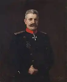 Falkenhayn joined the Prussian Army on 2 August 1870 at the Cuirassier Regiment "Queen" (Pomeranian) No. 2 in Pasewalk, he became a member of the Prussian General Staff in 1883 and Military attaché in Paris in 1887. In 1889 he was attached to the military headquarter of Wilhelm II and became the educator of Prince Wilhelm and Prince Eitel Friedrich of Prussia. He returned to the General Staff in 1894.[2][3] In 1895 Falkenhayn became the commander of the 1. Guard Dragoon Regiment "Queen Victoria of Great Britain and Ireland" and in 1898 Chief of Staff of the IX Army Corps. In December 1901 Falkenhayn took over the command of the 19. Cavalry-Brigade in Hanover and the 11th Infantry Division in Breslau (Wrocław) on 15 April 1908. Falkenhayn retired on 2 May 1910, was promoted to "General der Kavallerie" and appointed Oberhofmeister (Lord Chamberlain) of Empress Augusta Viktoria.[1][3]