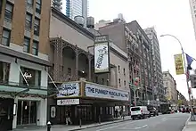 The Forrest finally saw some long-running shows in 1930, when the theater hosted a transfer of John Drinkwater's comedy Bird in Hand, the mystery play The Blue Ghost, and a transfer of the burlesque-themed farce Stepping Sisters.[55] The same year, Edgar Wallace's drama On the Spot ran at the Forrest for 167 performances,[55][56] and the theater temporarily became Wallace's Forrest Theatre.[45][57][58] By then, the Broadway theatrical industry was suffering due to the Great Depression: eighty-seven percent of productions in the 1929–1930 season had flopped.[43][59] In the Best of Families, which transferred to the Forrest in March 1931, had 141 total performances.[60][61] None of the seven subsequent shows at the Forrest, within a thirteen-month period starting in October 1931, had more than 36 performances.[60] A minor hit came in November 1932 with a transfer of The Good Fairy, featuring Helen Hayes and Walter Connolly.[62][63][64]