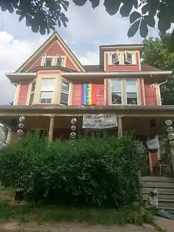 The structure at 909 E. University Avenue was built in 1905 as a three-story single family home.[4] In 1939, the house was rented by former members of Rochdale Cooperative House, another Ann Arbor cooperative, and opened under the name Congress House. In 1940, Congress House was relocated and the building was renamed the Muriel Lester Cooperative House, after British peace activist Muriel Lester. Lester Cooperative offered interracial and interfaith women's housing until 1943, when it too was relocated and the building at 909 E. University was sold.[5] During a period of expansive growth beginning in the early 1960s, the Inter-Cooperative Council looked into re-acquiring the building from its owners, Mr. and Mrs. Leonard F. Field. After a lengthy process of negotiations, the house was purchased on May 1, 1967, for a price of $49,500 (approx. $358,000 in 2016 inflation-adjusted dollars) and was opened as the Eugene V. Debs Cooperative House. It originally operated as an all-boys' cooperative house, with two apartment rooms available for married students. [6] By the mid-1970s, this was changed to allow students of any gender, and it remains a mixed-gender house today.