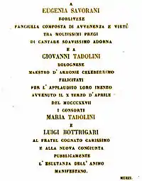 - The notice, or epigrafia, was published in the name of Maria Tadolini, the bridegroom's sister and her husband, Luigi Bottrigari. It is reproduced in Rambelli (1853), p. 92