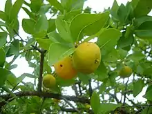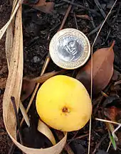 The flowers are white, 15–20 mm (0.6–0.8 in) wide. They occur either alone or in threes, and open between August and September, undergoing both self- and cross-pollination. The fruits (up to 1500 per tree) ripen mostly over a two-month period, between September and December depending on the climate. They fall from the tree when fully ripe, roughly at the start of the rainy season. The fruit is a yellow-orange berry, roughly spherical in shape, with a dry remnant of the calyx opposite to the stem; it is about one inch (2–3 cm or 0.8–1.2 in) in diameter and usually weighs 6–14 grams (0.21–0.49 oz).[3] It has a thin waxy skin and a sweet-sour and slightly astringent pulp, 1–2 mm thick, loosely enclosing one to three round and light gray seeds.