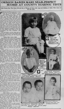In Oregon, better baby competitions started appearing especially at the State Fair they were done to determine which baby was the "better baby" from all the contestants that entered. This was done by checking their mental health, weighing them, and measuring their body proportions. Winning babies received cash prizes and were published in the newspapers. These competitions also promoted the idea that people should be more careful of whom they decide to marry and procreate with. The other proponent was to decrease baby mortality rates.[7]
