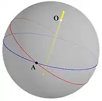 To arrive at a proof, Euler analyses what the situation would look like if the theorem were true. To that end, suppose the yellow line in Figure 1 goes through the center of the sphere and is the axis of rotation we are looking for, and point O is one of the two intersection points of that axis with the sphere. Then he considers an arbitrary great circle that does not contain O (the blue circle), and its image after rotation (the red circle), which is another great circle not containing O. He labels a point on their intersection as point A. (If the circles coincide, then A can be taken as any point on either; otherwise A is one of the two points of intersection.)