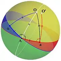 Now let us suppose that O′ is the image of O. Then we know ∠αAO = ∠AaO′ and orientation is preserved,[lower-alpha 1] so O′ must be interior to ∠αAa. Now AO is transformed to aO′, so AO = aO′. Since AO is also the same length as aO, ∠AaO = ∠aAO. But ∠aAO = ∠AaO′, so ∠AaO = ∠AaO′ and therefore O′ is the same point as O. In other words, O is a fixed point of the transformation, and since the center is also a fixed point, the diameter of the sphere containing O is the axis of rotation.