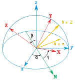 - (or ) is the signed angle between the N axis and the X axis (x-convention).