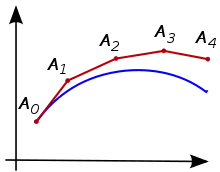Take a small step along that tangent line up to a point Along this small step, the slope does not change too much, so will be close to the curve. If we pretend that is still on the curve, the same reasoning as for the point above can be used. After several steps, a polygonal curve () is computed. In general, this curve does not diverge too far from the original unknown curve, and the error between the two curves can be made small if the step size is small enough and the interval of computation is finite.[2]