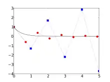 The exact solution is , which decays to zero as . However, if the Euler method is applied to this equation with step size , then the numerical solution is qualitatively wrong: It oscillates and grows (see the figure). This is what it means to be unstable. If a smaller step size is used, for instance , then the numerical solution does decay to zero.
